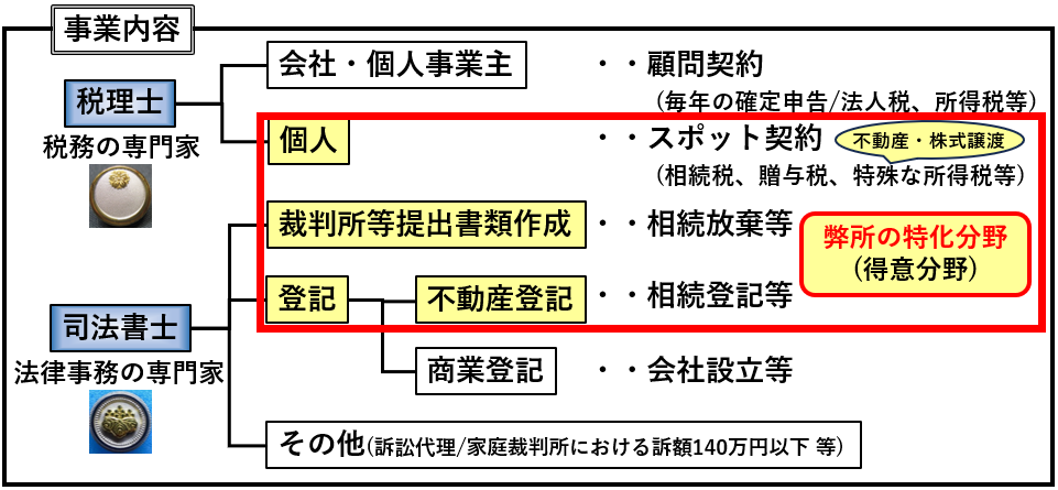 弊所は個人の「相続(生前対策を含む)」や「不動産・株式譲渡」業務に特化した事務所です。