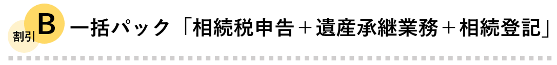 遺産総額が1億円の場合、報酬は相続税申告が900,000円(税理士のみに依頼)、遺産承継業務+相続登記等が1,290,000円(司法書士のみに依頼)であり、その合計約2,190,000円がかかるところ、一括パックであれば約80万円割安の1,400,000円でお受けします。※ただし、これと別に、実費として登録免許税等がかかることにご注意ください。