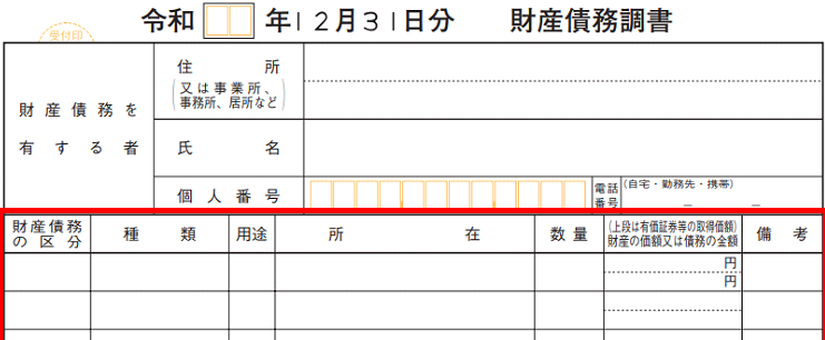 居住者の方で、12/31において5,000万円超えの国外財産を有する場合、国外財産の種類や価額等の必要な事項を記載したものです。財産は国内のみに存在するとは限らないため、国外財産を把握するのに重要な資料です。